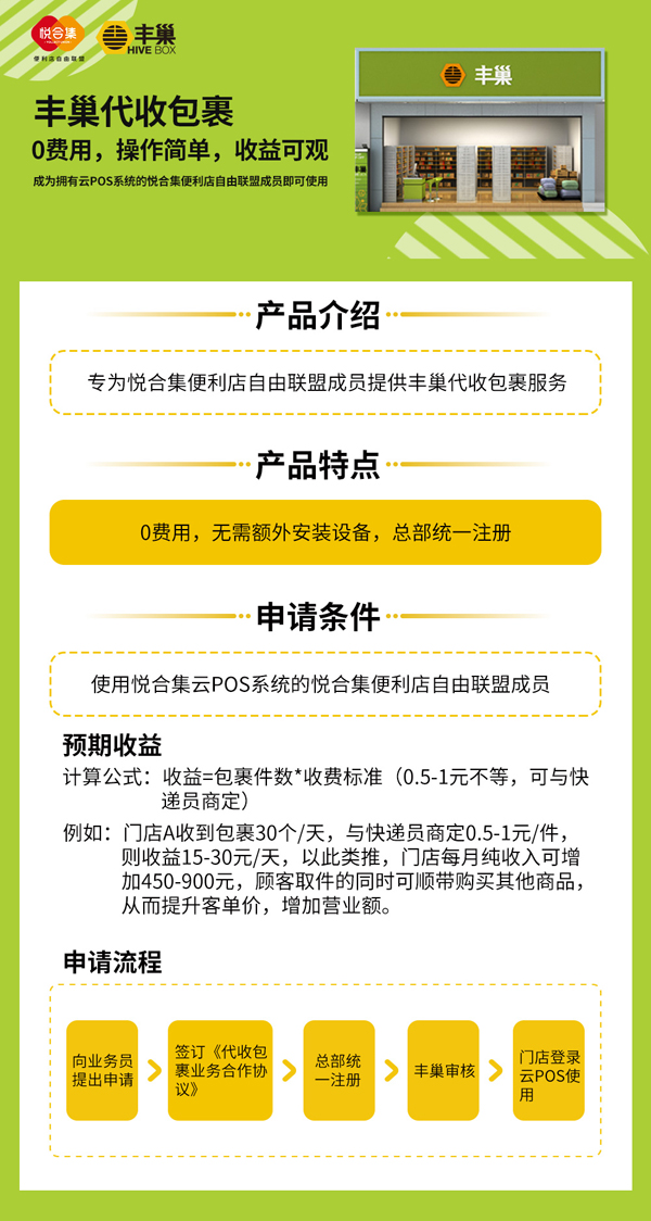 您可以编辑文字:“血拼双十一,疯狂网购有我在,XX小店帮你免费代收包裹,省心更安心!”到粉丝群和朋友圈,积极宣传推广,增加包裹量。 03 免短信费 前期注册成为与悦合集合作丰巢服务站点的门店,可免短信费用。 04 安全可靠 门店开通完毕后,快递扫码入机,系统自动发送取件码到取件人手机,为顾客提供更安全、更全面、更便捷的包裹管理服务。 05 免费引流 新顾客可通过短信找到门店,免费把顾客引流到店,为门店增加曝光量的同时,也会带动小店的消费。 06 免费维护客情 门店代收包裹可免去快递员自付短信费的烦恼,提高代收包裹数量。 小提示: 根据相关数据统计,某连锁便利店接入丰巢代收包裹后,每月约400-500个包裹代收快递件,多者可高达4000-5000个。