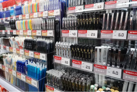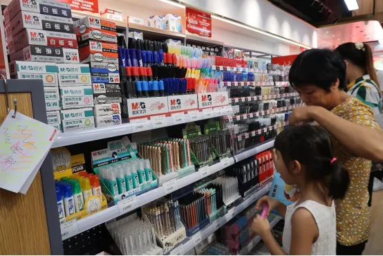 进店顾客基本上涵盖了整个小区的住户,临近开业期间,店内增设的文具用品区销量颇佳。 文具区域环境