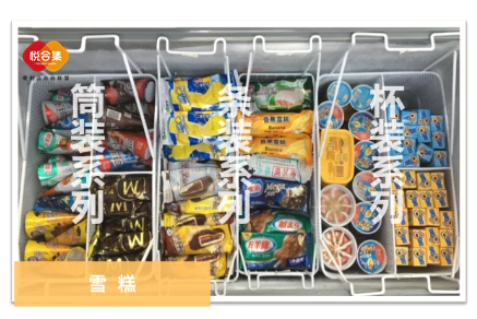 首先,按照包装,将商品区分开,比如杯装的,盒装的,条装的,冰棒等。 然后,再按照品牌将高毛利的商品,摆放在两边开门处,利于增加销售频次,价格低靠中间放。商品的数量不宜过多,不可超过装载线,避免挤压变形,或造成商品软化等质量问题。 甜筒类商品,要使用专用的篮子进行陈列,专用的篮子即是冻柜中网格较密的篮子,这类篮子可以减少甜筒尖尾断裂发生的概率,降低甜筒类商品的损耗。
